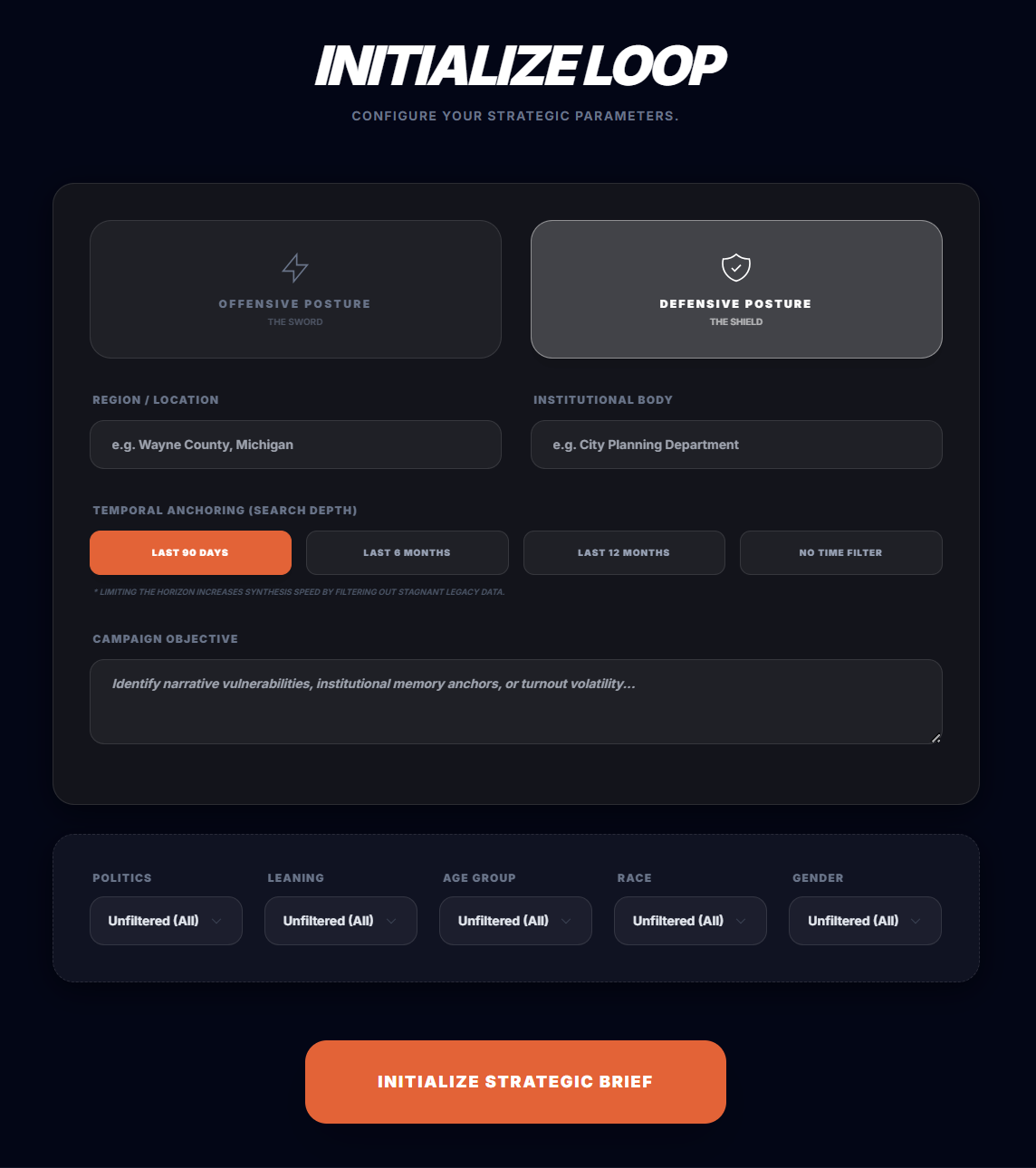 Primary User: Institutional Strategists and Political Advisors (e.g., Peterson Strategy Group) focused on narrative tracking, power retention, and regional demographic shifts.