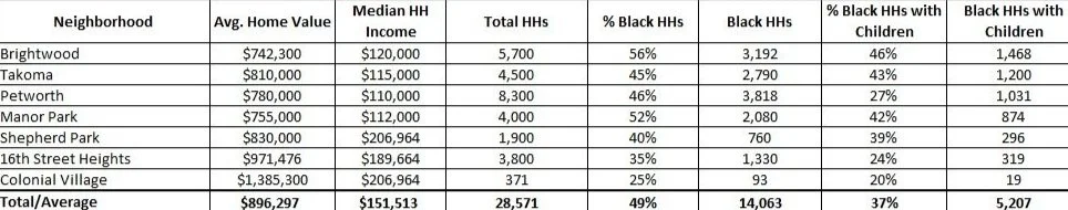 Greater Greater Washington, NeighborhoodScout, Niche, and City-Data for neighborhood descriptions and household statistics.